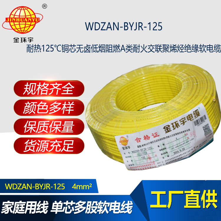 金環(huán)宇電線電纜 低煙無(wú)鹵A級(jí)阻燃耐火電線 4平方銅芯電線WDZAN-BYJR-125