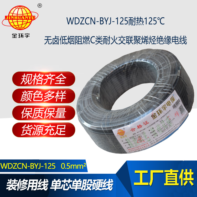 WDZCN-BYJ-125:即為銅芯耐熱125℃無鹵低煙阻燃C類耐火交聯聚烯烴絕緣電線,是指電線的絕緣層材料鹵素物質,在燃燒的情況下,不釋放含鹵氣體,煙霧濃度低,參照標準為JB/T 10491-2004,型號有WDZAN-BYJ-125、WDZBN-BYJ-125、WDZCN-BYJ-125等,
