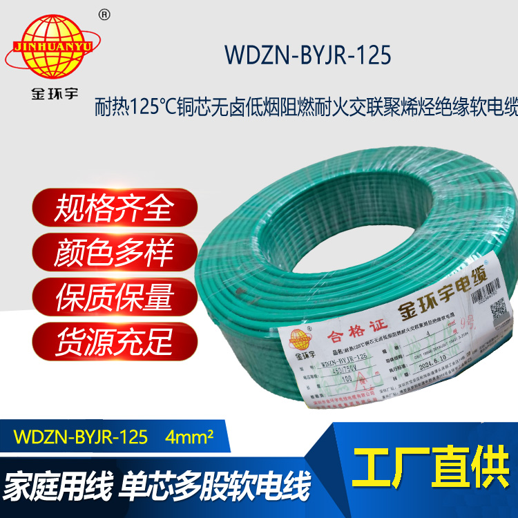 金環宇電線電纜 低煙無鹵耐熱阻燃4平方銅芯電線 WDZN-BYJR-125 耐火絕緣電線