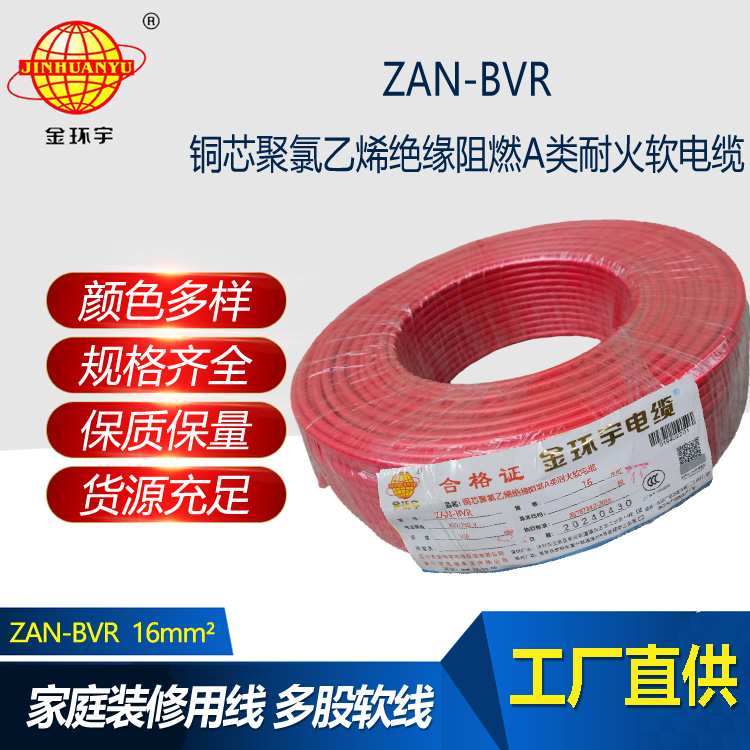 金環宇電線 A級阻燃耐火軟電線ZAN-BVR 16平方 bvr電線