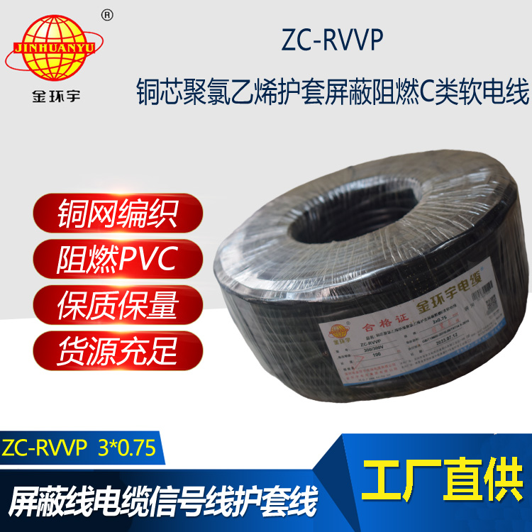 金環宇電纜 深圳rvvp阻燃c類電纜 ZC-RVVP3X0.75銅編織屏蔽電纜線