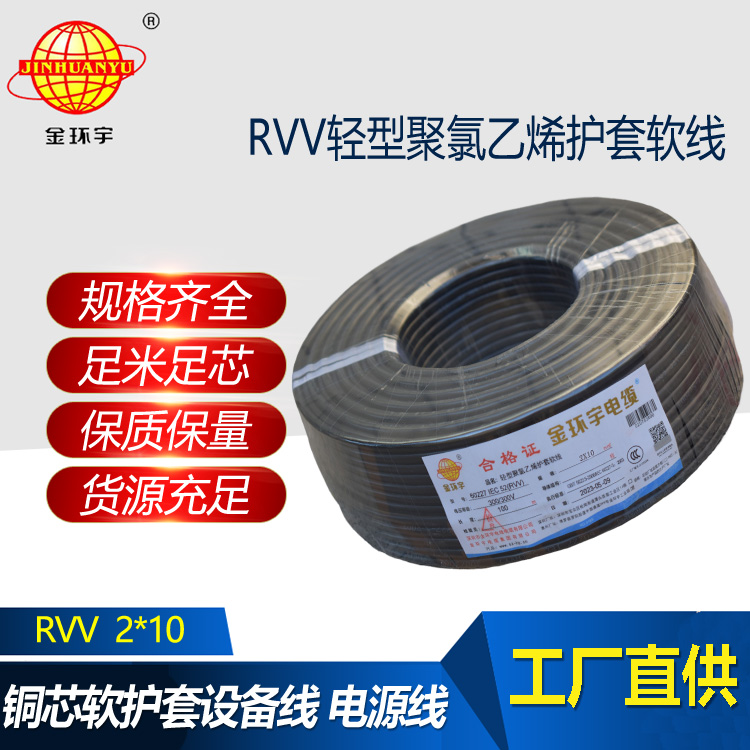 RVV2*10平方電纜是2根10平方銅芯交聯(lián)聚乙烯絕緣聚氯乙烯護(hù)套電力電纜,帶阻燃特性。阻燃—ZR 阻燃A類,阻燃B類,阻燃C類。金環(huán)宇電線電纜產(chǎn)品上千種,歡迎來電咨詢。