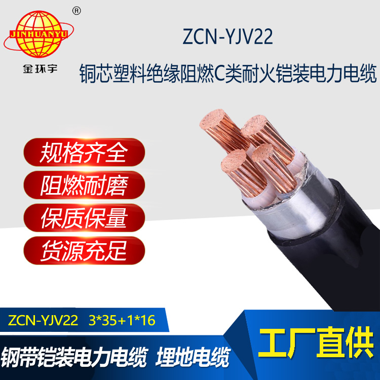 金環宇電線電纜 三相四線阻燃耐火鎧裝電力電纜ZCN-YJV22-3X35+1X16平方